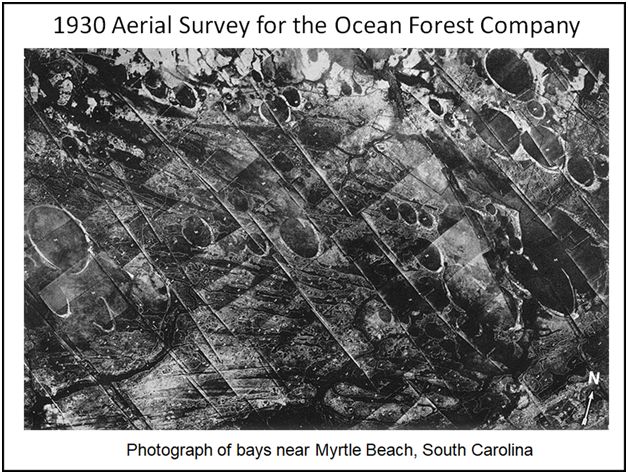 2) In 1930, the Ocean Forest Company hired Fairchild Aerial Surveys to photograph five hundred square miles of coastal plain near Myrtle Beach in South Carolina. The photographs revealed a large number of elliptical features aligned toward the northwest. Many of the bays have been given names. The large bay in the left of this image is 1,920 meters long, and it is called Cotton Patch Bay by the US Geological Survey. The arrow in the lower right corner points to the North.