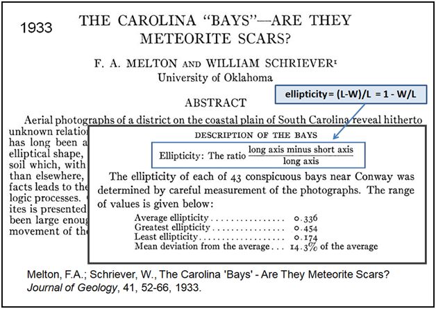 3) In 1933, Melton and Schriever from the University of Oklahoma published an analysis of the bays. The authors described the elevated sandy rims, the fact that overlapping bays preserve their elliptical outline, and that small bays have a more circular shape than larger bays. Melton and Schriever remarked that “these features are not known to exist elsewhere on the Earth's surface”. After considering eolian, lacustrine and other terrestrial mechanisms, the authors proposed that the bays most likely were created by a meteorite shower coming from the northwest. However, they concluded that the impact hypothesis could not be confirmed because the rims did not contain bed-rock fragments, and there were no traces of meteorite fragments or magnetic anomalies in the bays. Melton and Schriever introduced ellipticity as an important characteristic of the Carolina Bays. Ellipticity is defined as the long axis minus the short axis divided by the long axis, which is equal to one minus the width-to-length ratio.