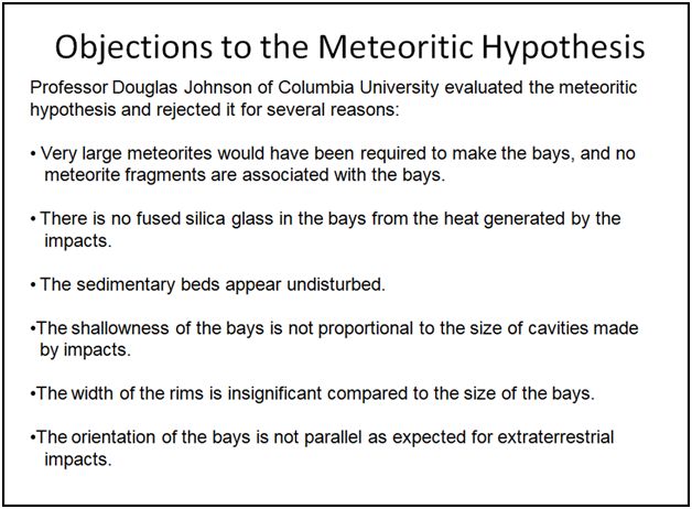 4) The extraterrestrial impact hypothesis was immediately criticized and rejected. Professor Douglas Johnson of Columbia University noted that the bays had no meteorite fragments or fused silica. Also, the sedimentary beds of the bays appeared undisturbed, the width of the rims was too small compared to the size of the bays, and the orientation of the bays was not parallel as would be expected for an extraterrestrial meteorite shower.