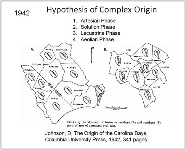 5) Professor Johnson proposed his own hypothesis of complex origin in which water flow from artesian springs operating in part by solution created shallow basins that formed lakes. Wave action then shaped the bays, and wind-blown sand formed the rims. Johnson’s hypothesis did not specify how the overlapping bays were produced.