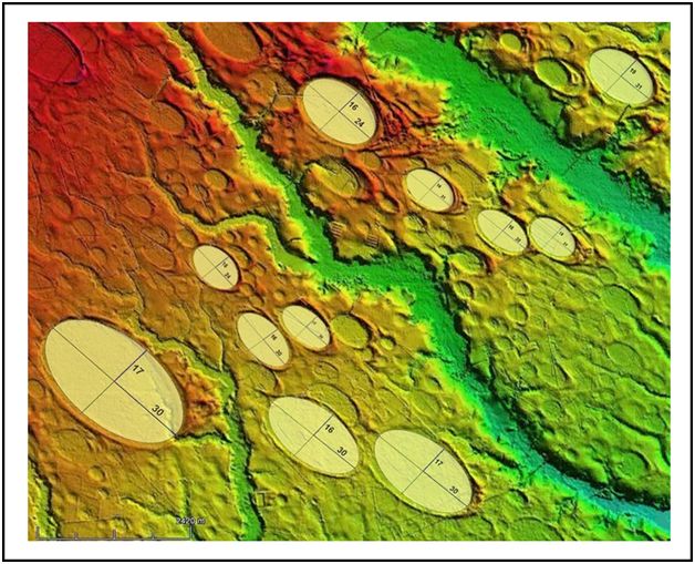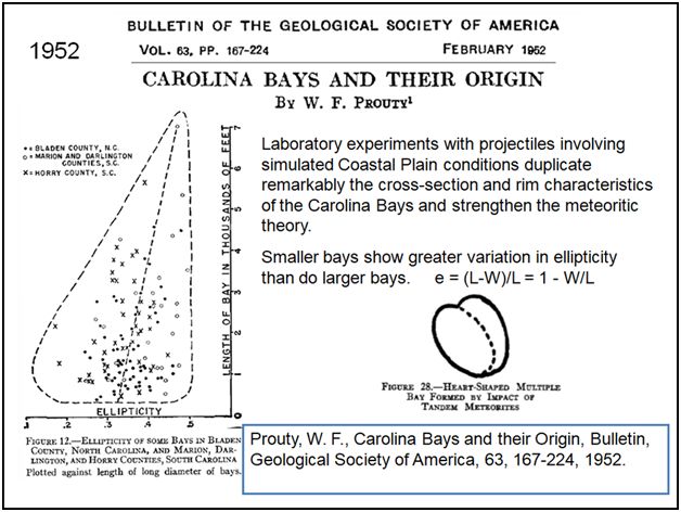 6) In 1952, Prof. Prouty from the University of North Carolina, opposed Johnson’s terrestrial hypothesis. He noted that statistical studies of the orientations show that smaller bays have a greater divergence from the mean than larger bays. Smaller bays also show greater variation in ellipticity than larger bays. Melton and Schriever had proposed that this variation in ellipticity could be explained by the effect of the atmosphere on the meteorites. Smaller projectiles would be slowed down more than the larger projectiles, and they would impact the Earth with a greater vertical component, thus creating scars with smaller ellipticity, or less elongated in shape.