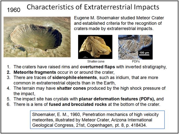 7) In 1960, Eugene Shoemaker established criteria for distinguishing extraterrestrial impact sites from craters created by solution, volcanism or other terrestrial processes. The criteria can be used even after substantial degradation of an impact site by wind and water erosion.