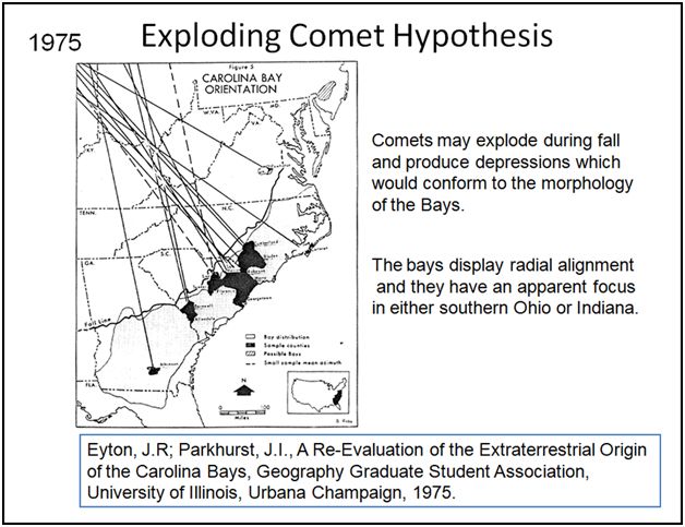 8) In 1975, Eyton and Parkhurst attempted to explain the Carolina Bays as the result of airbursts caused by explosions of icy comet fragments with some of the characteristics of the 1908 event over Tunguska in Siberia. The authors drew lines along the bay azimuths, which appeared to converge in southern Ohio or Indiana. This suggested the place where the comet had entered the atmosphere and started to disintegrate.