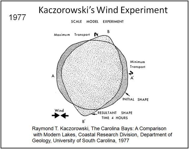 9) In 1977, Raymond Kaczorowski wrote a thesis describing an experiment on a sand table using a fan to simulate the winds that he proposed shaped the Carolina Bays and their rims. The wind direction in the graphic denotes an alternating wind direction, reversing 180º at regular intervals during the experiment. The wind modified the shape of the original pool, but it did not produce an elliptical shape.