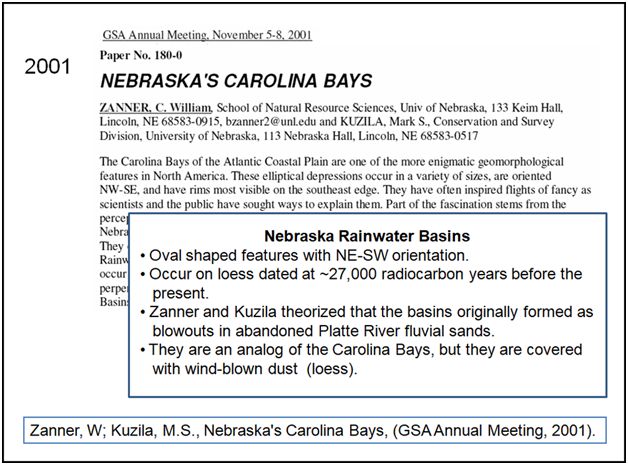 13) In 2001, Zanner and Kuzila announced that Nebraska also had geological structures similar to the Carolina Bays. The Nebraska Rainwater Basins were originally discovered by analysis of USGS Digital Orthophoto Quadrangles.