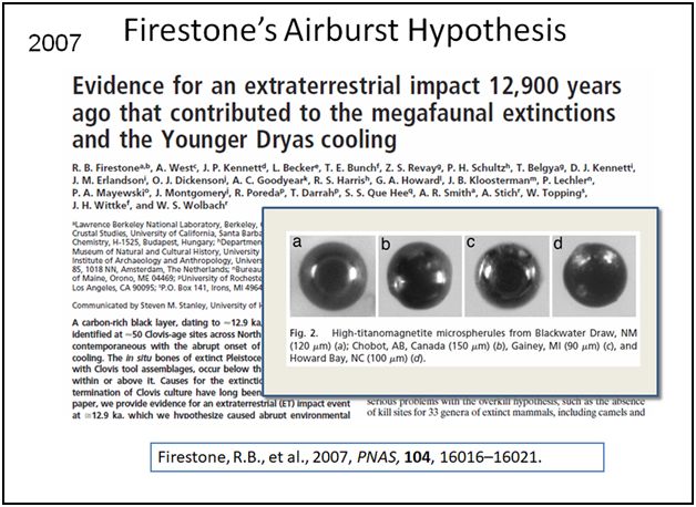 18) Also in 2007, Firestone and 25 co-authors proposed that an extraterrestrial impact caused the extinction of the North American megafauna and triggered the Younger Dryas cooling event. This paper reported magnetic microspherules and nanodiamonds at the Younger Dryas boundary that were said to be evidence that one or more large extraterrestrial objects exploded over North America destabilizing the Laurentide Ice sheet and causing extensive biomass burning.