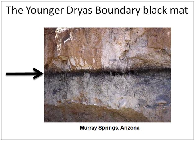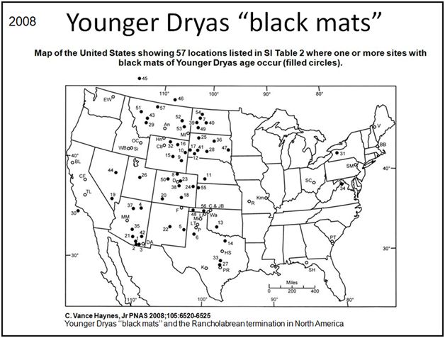 19) Firestone’s 2007 paper proposed that one or more large, low-density ET objects exploded over northern North America causing extensive biomass burning. Many locations at the YDB boundary have a black, carbon-rich layer with charcoal, soot, carbon spherules and glassy carbon.