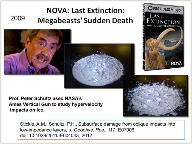 In the TV show, Prof. Peter Schultz from Brown University was shown studying how a layer of ice shields the Earth’s surface. The video demonstrated that a high-speed impact on a layer of ice ejects pieces of ice radiating from the point of impact, and the surface under the ice is only slightly disturbed, but no crater forms. Prof. Schultz published his research in 2012.