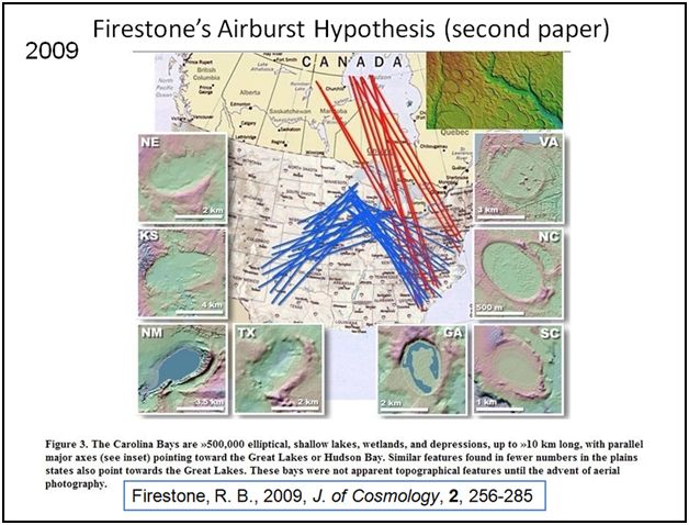 22) In 2009, Firestone replied to the criticism about the 2007 paper. Firestone maintained that the spherules at the Younger Dryas Boundary were suitable indicators of an extraterrestrial airburst, and that the conflicting dates for the Carolina Bays could have resulted from inadvertent sampling of older sediment that may have shifted over time. Firestone had proposed that a meteor had exploded in an airburst because there was no extraterrestrial impact crater. In this paper, he also suggested that the Laurentide ice sheet could have shielded the ground and prevented the formation of a crater, as proposed by Prof. Schultz.