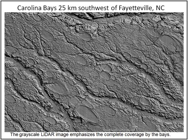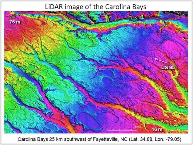 Also, LiDAR revolutionized surface imaging and it became the primary method of visualizing the Carolina Bays. The laser pulses used by LiDAR can show surface features in unprecedented detail.