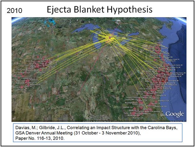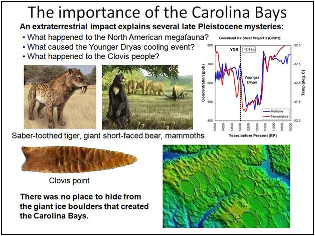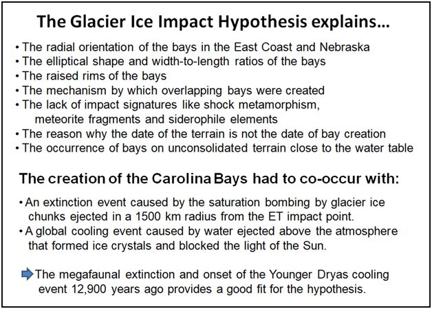 59) My paper proposes that the Carolina Bays were produced by a saturation bombardment of glacier ice chunks ejected by an extraterrestrial impact on the Laurentide Ice Sheet. Water ejected above the atmosphere would have produced a cloud of ice crystals that blocked the light of the Sun. Thus, the formation of the Carolina Bays has to coincide with an extinction event on the eastern half of the United States and the onset of a global cooling event. This combination of conditions happened approximately 12,800 years ago.