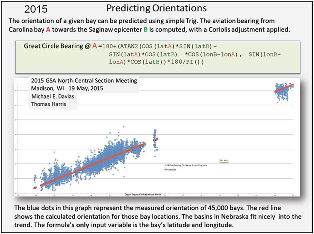 27) By 2015, Davias had used the orientation of 45,000 bays to derive a trigonometric equation to calculate the azimuthal orientation of the Carolina Bays and Nebraska Rainwater Basins just from their coordinates.