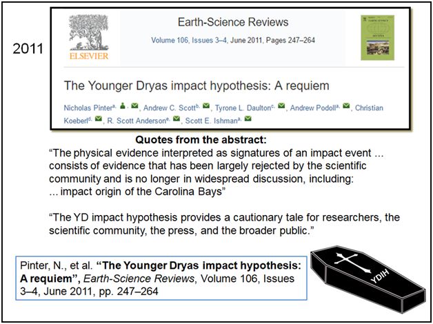 28) In 2011, seven university professors from the U.S., the UK and Austria collaborated on a “requiem” paper declaring the death of the Younger Dryas impact hypothesis. In the Roman Catholic Church, a requiem is a Mass for the repose of the souls of the dead. The paper went point-by-point over Firestone’s claims and showed that none of his evidence could be conclusively considered indicative of an extraterrestrial impact. Firestone’s papers had not shown an impact crater, meteorite fragments, petrographic shock metamorphism, enrichment of siderophile elements or other criteria established by impact science. The microspherules reported by Firestone had not been established by any previous research as a specific characteristic of extraterrestrial impacts.