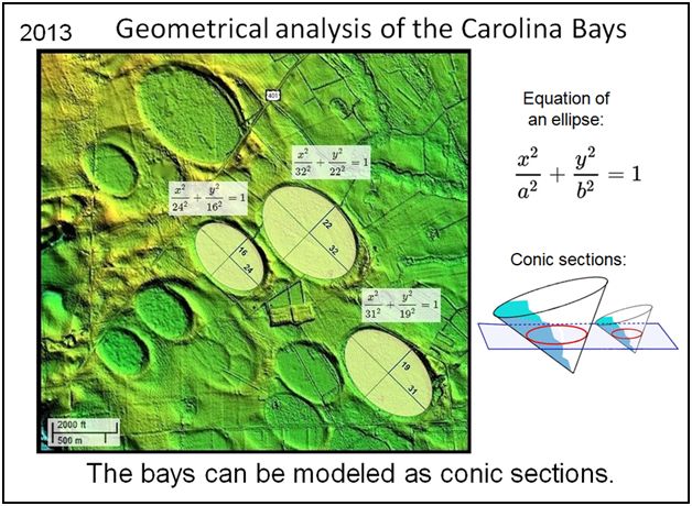 30) Many researchers had described the Carolina Bays as either oval or elliptical, but nobody had done a geometrical analysis to verify whether the bays were truly elliptical. In 2013, using Google Earth with LiDAR overlays, I found that an ellipse with the same width-to-length ratio as a Carolina Bay fit the bay exactly after scaling and rotating the ellipse. The bays can be measured with Google Earth’s measuring tool, and a graphics program such as Photoshop can be used to manipulate ellipses and superimpose them on captured images of the bays. In general, the fit is so good that it is possible to conclude that the archetypal shape of the Carolina Bays is elliptical and that the bays can be modeled as mathematical conic sections.