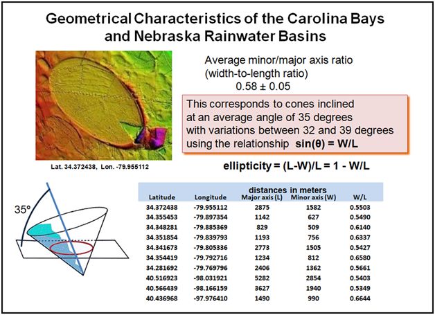 The elliptical shapes correspond to cones inclined at about 35 degrees. The bays represented in this table have ellipticities within the ranges described by Prouty in 1952. Statistical analysis of the width-to-length ratios of the Carolina Bays and Nebraska Rainwater Basins showed that they cannot be distinguished on the basis of their geometry.