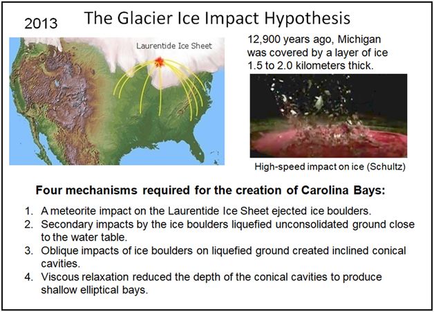 34) In 2013, I developed the Glacier Ice Impact Hypothesis, and I identified four mechanisms that were necessary for the formation of the Carolina Bays.