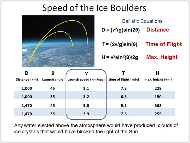 35) The speeds required to launch ice projectiles from Michigan to the East Coast can be calculated using ballistic equations. This table shows that the ice boulders ejected by the extraterrestrial impact needed speeds from 3 to 4 km/sec at angles from 35 to 45 degrees to reach the East Coast 1000 to 1500 kilometers away. In addition, the calculations of maximum height and time-of-flight show that all the ballistic trajectories were suborbital space flights with heights of 150 to 370 km and flight times of 6 to 9 minutes. Since the atmosphere extends only to about 100 km, a substantial portion of the trajectories would have been in the vacuum of space. Above 35 kilometers from the Earth's surface, the atmospheric pressure is below the triple point of water, and water cannot exist in the liquid state. Any liquid water ejected above the atmosphere would have produced clouds of ice crystals that blocked the light of the Sun