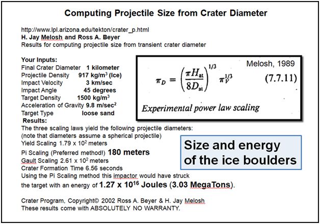 36) Knowing the speed of the ice boulders, we can use scaling laws relating energy to crater size for estimating the mass of the projectiles. The scaling laws were derived from detonations of chemical explosives and nuclear bombs in the 20th century.