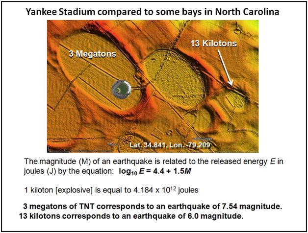 The University of Arizona had a program that implemented the scaling equations from Prof. Melosh’s 1989 book. With this program, I calculated that a Carolina Bay with a diameter of 1 kilometer could have been created by an impact of an ice sphere with a diameter of 180 meters traveling at 3 km/sec with an energy of 3 Megatons.