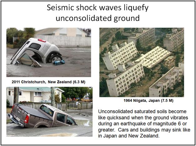 38) This slide illustrates the liquefaction of saturated soil subjected to seismic vibrations of magnitude 6.0 or higher.
