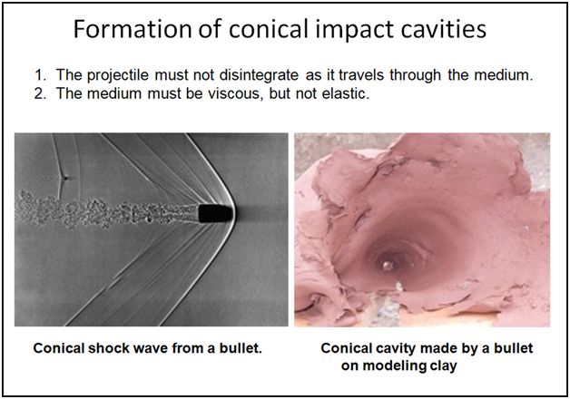 41) Conical impact cavities have not received much attention in the scientific literature because they are transient and usually disappear in fractions of a second. A projectile traveling through a medium creates a conical shock wave. The shape of the shock wave can be preserved if two requirements are met:
