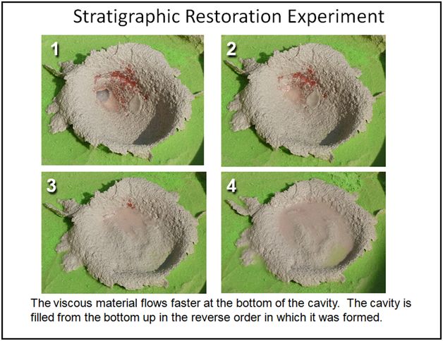47) Here we see how adjacent conical craters become overlapping bays. Viscous relaxation driven by gravity decreases the depth of craters and partially reconstitutes the stratigraphy by the flow of material parted during the excavation. Shaking the container speeds up viscous relaxation by promoting liquefaction.