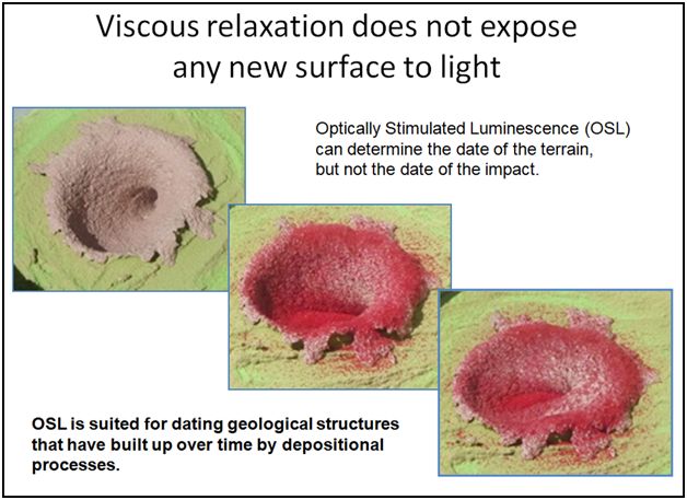 Optically Stimulated Luminescence (OSL) estimates the time since last exposure to sunlight for quartz sand and similar materials. The use of OSL for dating the bays has assumed that the subsurface of the Carolina Bays was exposed to light at the time of bay formation in a gradualistic depositional process. However, the experimental model shows that impacts on viscous surfaces are plastic deformations that do not expose the subsurface to light. Viscous relaxation restores the original stratigraphy without causing additional exposure to light.
