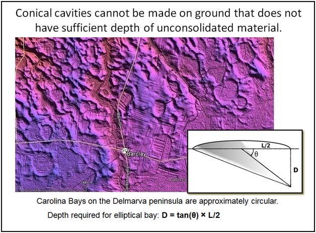 51) So far, we have discussed elliptical bays, but the hypothesis also has to account for all types of Carolina Bays, including the circular bays in the Delmarva Peninsula. The depth of unconsolidated material required for the formation of an elliptical bay can be estimated by the formula: D = tan(θ)× L/2