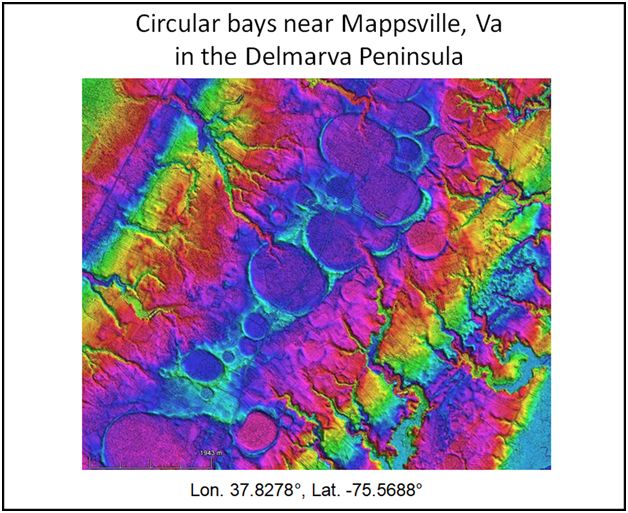 26) By 2010, Michael Davias had integrated hundreds of LiDAR images of Carolina Bays and Nebraska Rainwater Basins with Google Earth. He used great circle trajectories adjusted for the Coriolis effect to calculate the convergence point of the bays. Previous attempts by others to find a focal point had failed because they had used straight lines on flat maps and they had ignored the flight time of the projectiles. Davias benefitted from having Google Earth to perform the triangulation.
