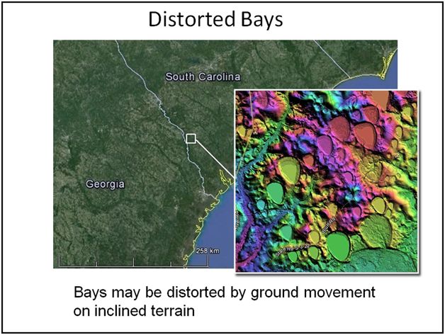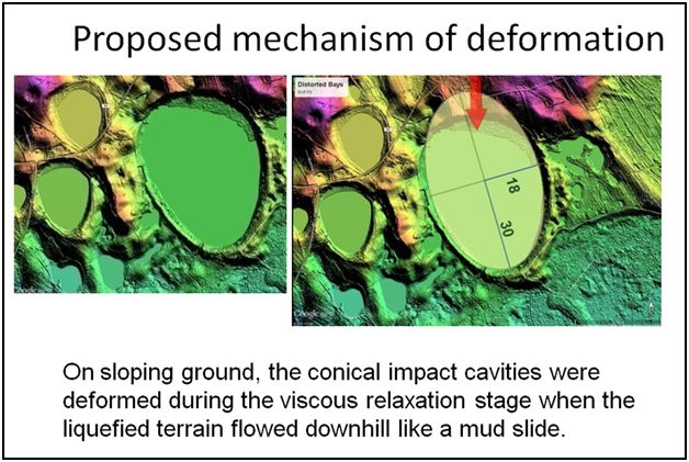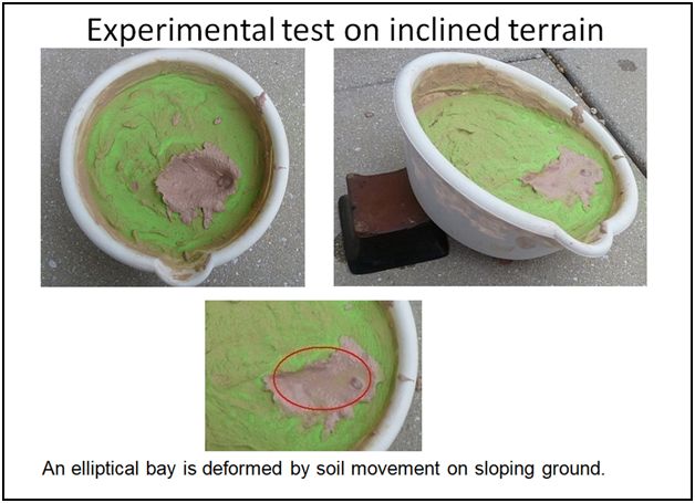 55) The experimental model makes it possible to test this hypotheses of bay formation. This experiment shows an elliptical impact cavity that is deformed during viscous relaxation when the terrain is inclined. The deformation is caused by soil flowing downhill toward the cavity after the formation of the conical cavity. The resulting structure bears some similarity to the bays near the Savannah River.