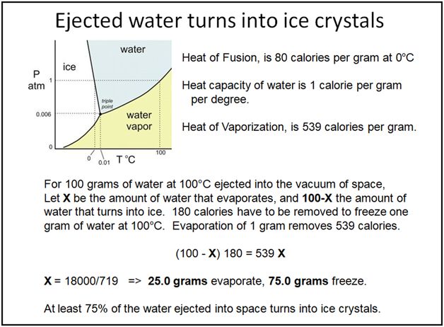 57) In the vacuum of space, water can only exist as solid ice or water vapor. Using thermodynamics, we can estimate that at least 75% of the water ejected above the atmosphere turned into ice crystals that would have blocked the light of the sun. The ice crystals would have eventually sublimated, ending the cooling event. From the duration of the Younger Dryas, it is possible to get a rough estimate of the water ejected by the extraterrestrial impact on the Laurentide Ice Sheet.